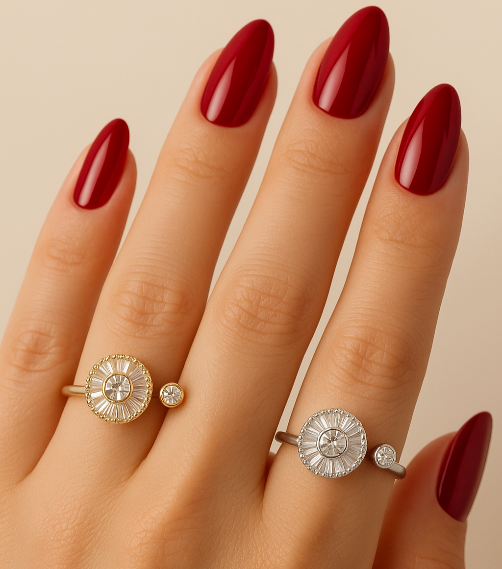 U kombinaciji sa braon i zemljanim nijansama, prsten postaje detalj koji osvetljava ceo outfit. Zlatna varijanta unosi toplinu i eleganciju, dok srebrna daje moderan kontrast koji osvežava jesenji look.